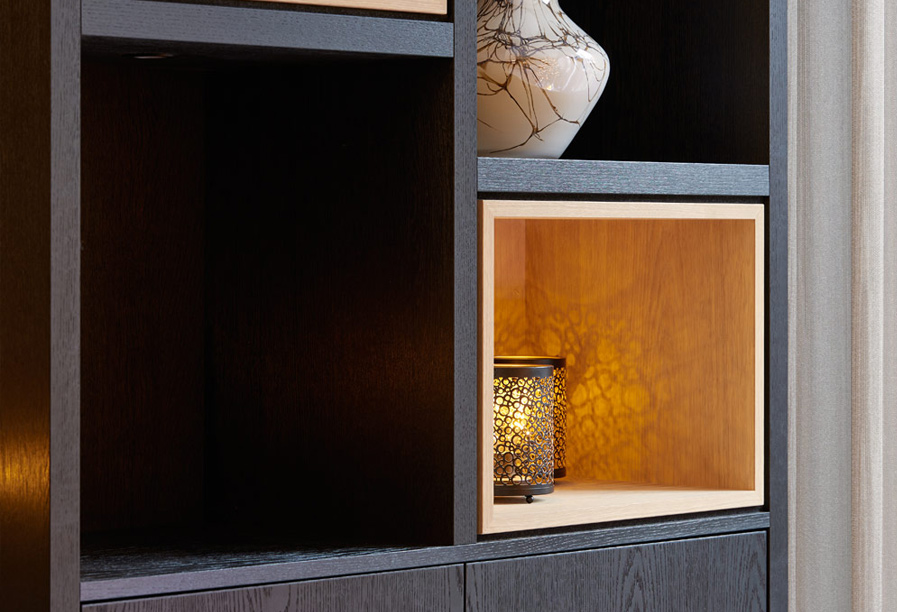 Is uw meubel voorzien van deuren of lades dan voorzien we deze van de hoogste kwaliteit scharnieren en geleiders met softclose functie. Liever geen handgrepen? Dan kunt u kiezen voor de verzonken greeplijst in verschillende kleuren. De verwerking van sfeerverlichting in de meubels is ook een graag geziene optie.